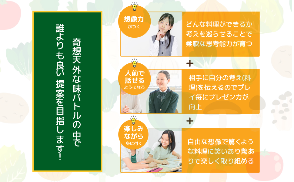 ランダムに引いた食材とお題をもとに即興で料理を考え発表する、想像力とプレゼン力の勝負ゲーム